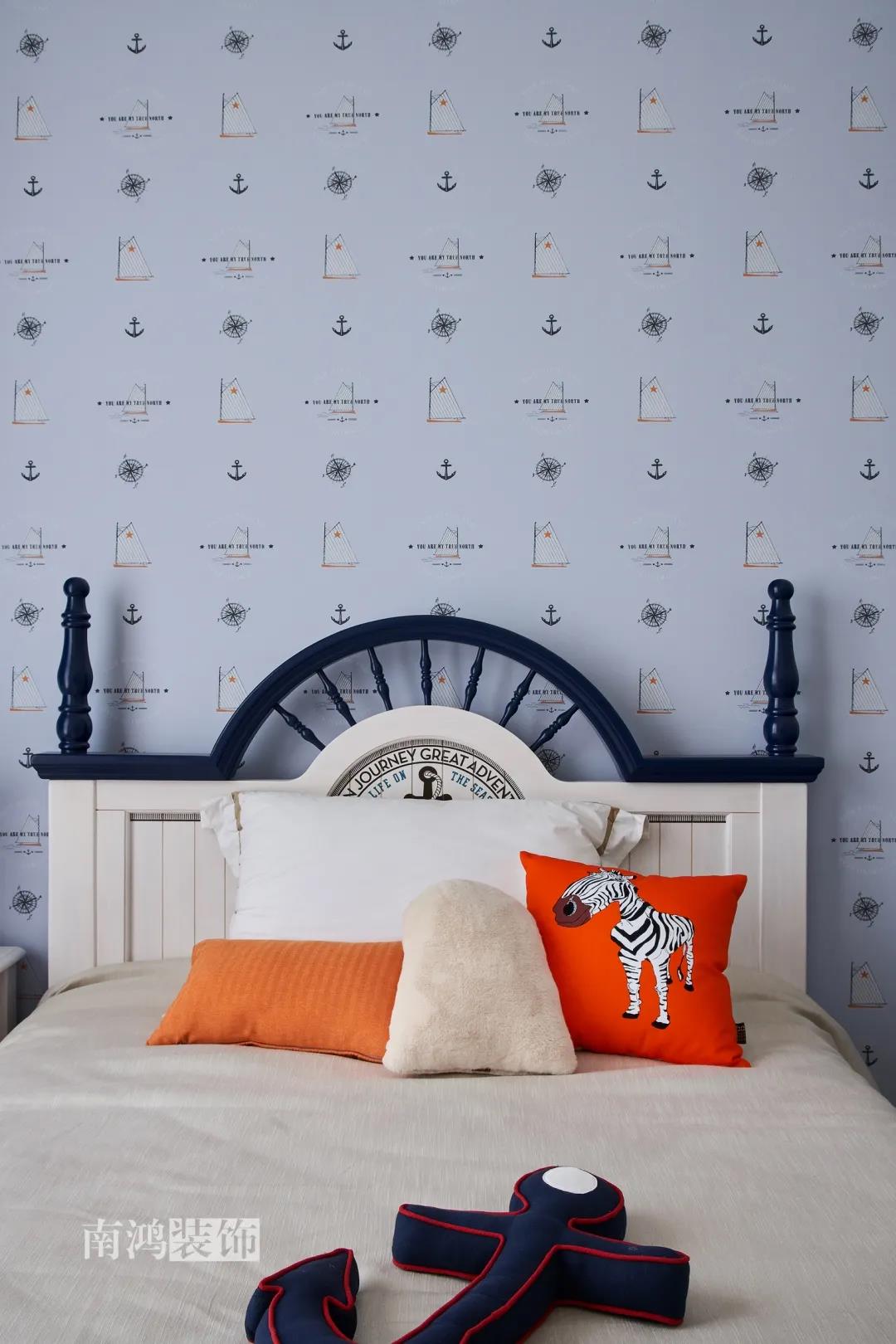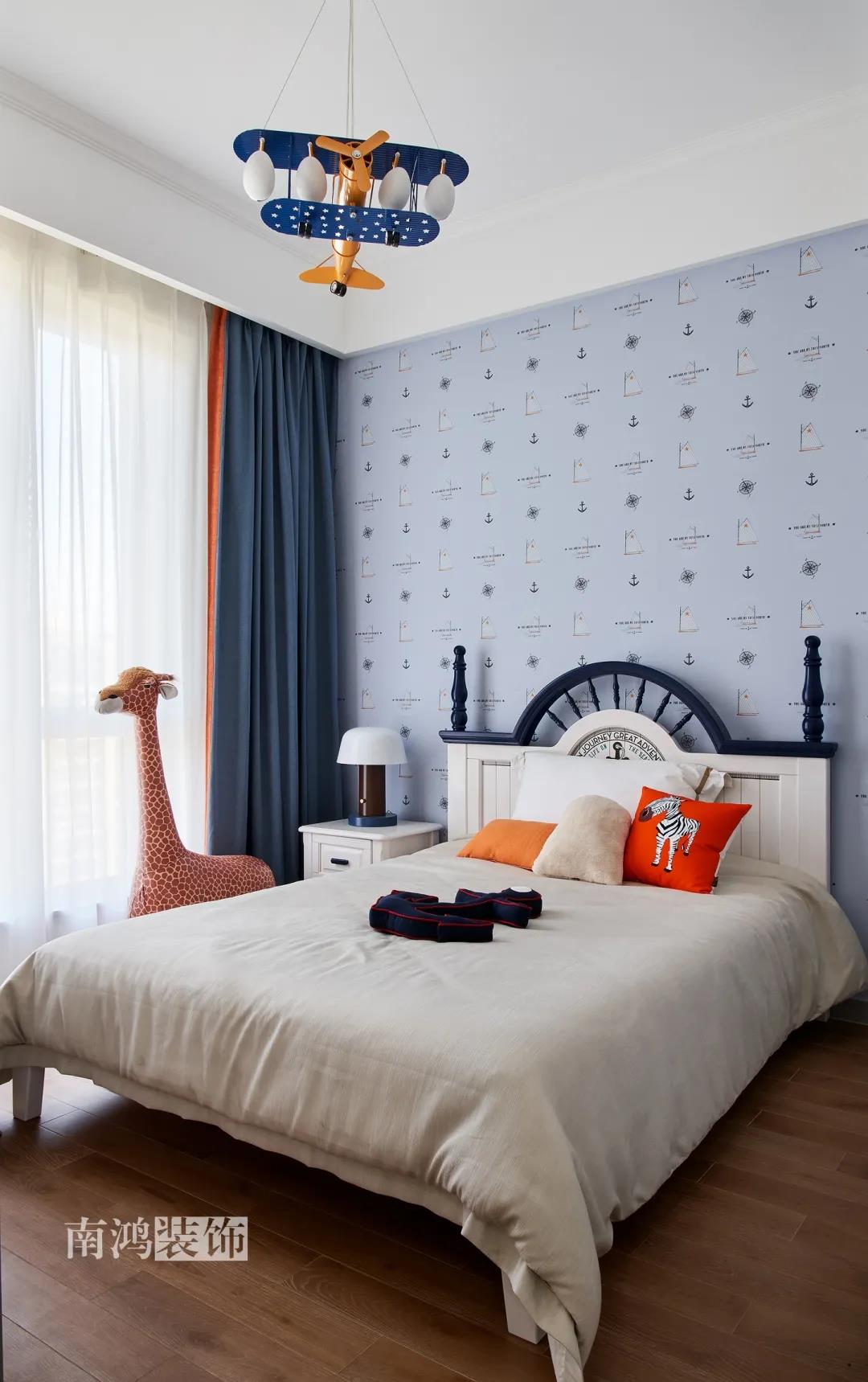 兒童房主打男孩喜愛的藍色系,飛機樣式的吊燈與長頸鹿玩偶充滿著浪漫的想象,將活潑的童趣與審美融合得恰到好處。