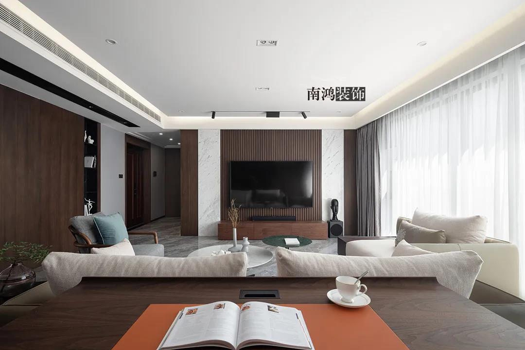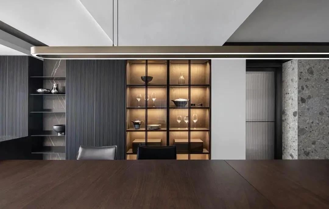 如果想進(jìn)一步提升裝飾效果,可將線性光源穿插在木格柵之中,讓空間能在光影中盡顯朦朧雅韻~