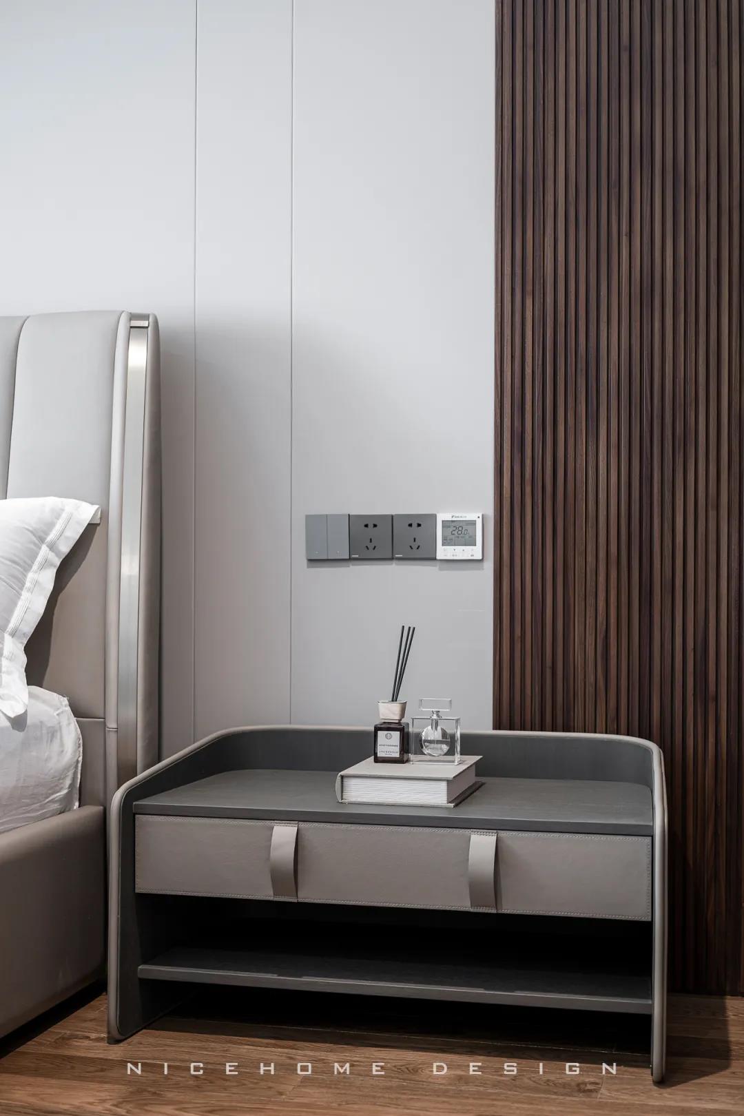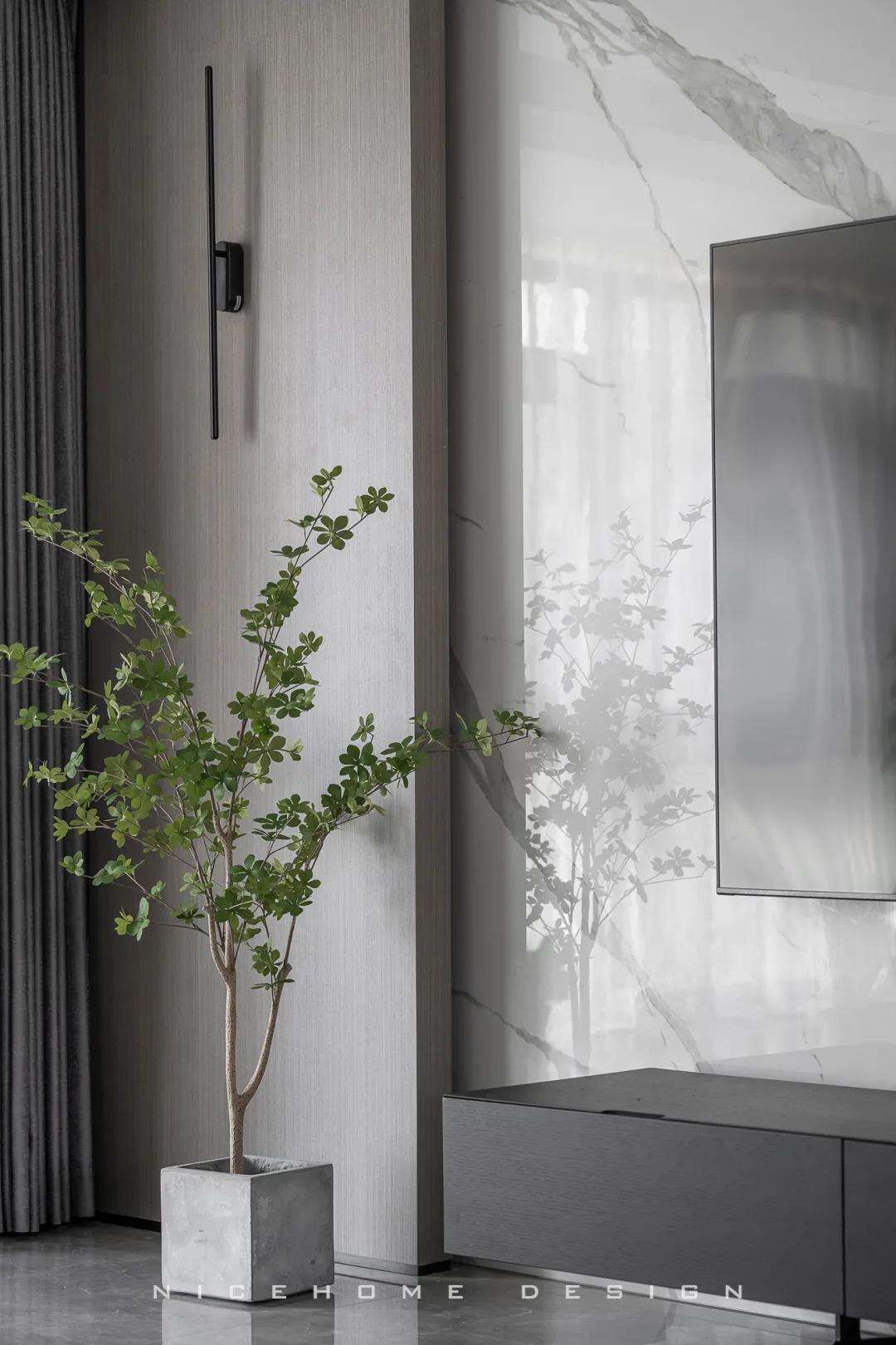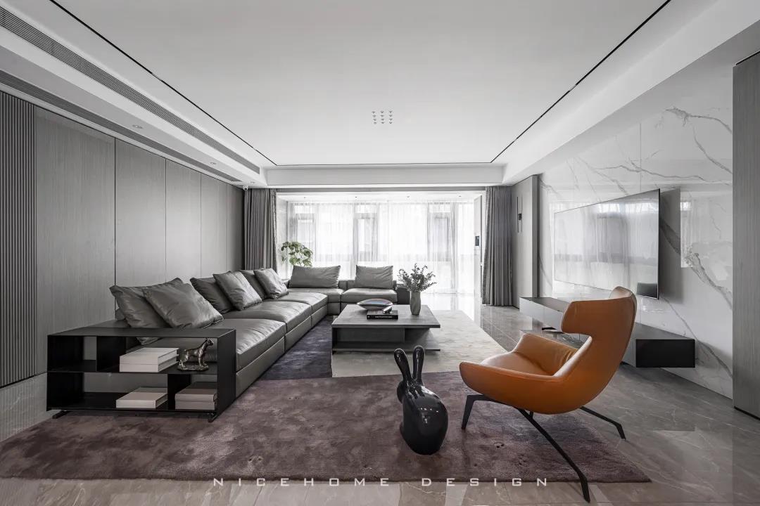 關于家的氛圍感營造,色彩和燈光是至關重要的兩點。 現代風格的色彩設計受現代繪畫流派思潮影響很大,通過強調原色之間的對比協調來追求一種具有普遍意義的永恒的藝術主題,裝飾畫、飾品的選擇對于整個色彩效果則起到錦上添花的作用。 除了色彩上的和諧配比,設計師在本案燈光設計上也下了許多功夫,重點突出:一是燈光功能布局的細化,照明燈光、背景燈光和藝術燈光三種效果有機組合;二是燈光控制的智能化、模式化,也即控制方式由分開的開關變為集中遙控,通過設定視聽、會客、餐飲、學習、睡眠等組合燈光模式,來達到理想效果。 客廳 LIVING ROOM 客廳包進陽臺,最大限度引入外部光線,呈現明亮通透的視覺效果。對于主人而言,室內的隱私也相當重要,因此在陽臺口安上了窗簾。 空間布局開敞,沙發后留出距離讓公區域動線更加流暢。硬裝與家具的線條都十分明晰,簡約的架構創造出清爽有序的居家環境。 質樸的木飾面相比其他材質而言要更加低調,顯露出不張揚的高級感。與之呼應的暖咖色皮藝沙發搭配絨布拼色地毯,和諧的色調、統一的氣質,多種材質交織,賦予空間自然的呼吸與舒緩的心跳。 陽臺一側的立面空間不做絲毫浪費,收納柜中嵌入了洗手臺和直飲水機,視覺上渾然一體。 餐廳 DINING ROOM “是誰來自山川湖海,卻囿于晝夜,廚房與愛。”時尚利落的現代感在餐廳空間鋪展開來,散落于細節間的精致能輕松勾起用餐者的食欲。 餐廳與廚房以長長的玻璃移門相隔,空間視野相當開闊,移門一開,餐廚互動便沒了阻礙。 大理石紋的餐桌組合不銹鋼桌腳,圓角設計勾勒著藝術感知。背景做整墻柜體,除了收納餐具、酒品之外,也方便展示一些個性單品。 廚房 KITCHEN L型布局廚房,有足夠的操作臺讓主人大展廚藝,白色系能將空間寬敞明亮的感覺放大到極致。 過道 CORRIDOR 過道,統一的原木色讓視覺保持極致簡潔,盡頭處的燈光打下來,讓墻上的藝術畫作成功凝固住了剎那間的美好。 臥室 BEDROOM 主臥的陽臺也包進室內,頓時有種面積擴大了兩倍的感覺,更大的面積也意味著更多的活動空間與收納空間。 房間過大容易顯得空蕩蕩的,因此我們在床尾設置了床尾凳和地毯,用以豐富視覺與功能性,頂部依然是簡練的無主燈設計。 睡眠區域簡潔沉穩,高級灰色調與深木色有助于營造安靜而放松的休憩氛圍。 休閑陽臺位置擺放經典的Togo沙發,松松軟軟的坐感簡直不要太舒服! 書房 STUDY 一間高品質的書房背后,必定有著一顆熱愛學習用心工作的靈魂。厚實的桌體組合纖細的桌腳,書桌給人的設計感很強,搭配吊燈和地毯,進一步勾勒出空間的格調與優雅。 休閑室 LEISURE ROOM 家里的休閑室,延續了公區域大面積的灰色質感元素,地臺+懶人沙發+電視,在這里可以自由自在地做自己想做的任何事! 衛生間 BATHROOM 主衛面積富余,在淋浴間和浴缸之外還留出了大量走動空間,再加上雙臺盆設計,力求將舒適度拉到最大。 公衛與次衛,空間分別用灰色與白色的瓷磚統一鋪就,干凈整潔,白凈的基底疊加上黑色線條,看上去會更有品質且視覺不再單一。
